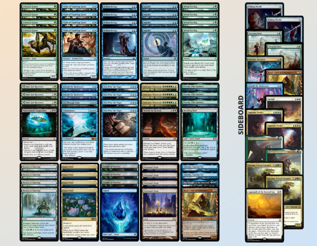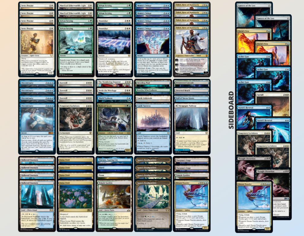 このデッキもデッキの軸となるのは《睡蓮の原野》で、《厳しい試験官/Strict Proctor》と《不連続性/Discontinuity》によって《睡蓮の原野》のデメリット能力を打ち消して爆発的なマナ加速が行えるようになっています。さらにそこから《ドミナリアの英雄、テフェリー/Teferi, Hero of Dominaria》に繋げることによって大量のマナを使うことができるようになります。