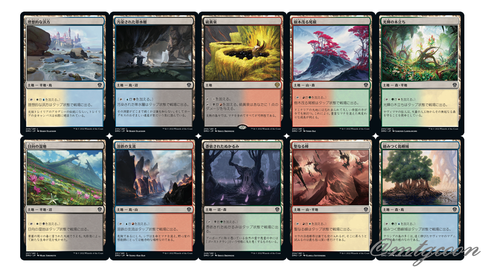 まずは、タップインの2色土地が収録されています。「団結のドミナリア」では版図がキーワードになっているので、基本土地タイプを持っています。これによって版図はもちろんのこと、土地サーチなどにも引っかかりやすくなっています。