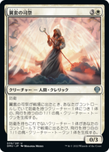 《翼套の司祭》は防衛クリーチャーの数だけ1/1飛行のトークンを生成することができるカードで、デッキの核になっています。基本的に1/1飛行トークンで殴り勝つゲームプランになっています。