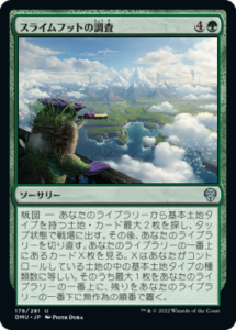 《花咲く蔦壁》はトップ6枚から土地1枚を手札に加えることができます。《ウェザーシード盟約》はⅠ章で基本土地カードをサーチして戦場に出せます。《荒野の偵察》は基本土地カードをサーチして戦場に出すことができ、キッカーしていればトークンのおまけ付き。《スライムフットの調査》は5マナとやや重いものの基本土地タイプを持つ土地を2枚サーチして戦場に出すことができるので、版図5種類が期待できます。