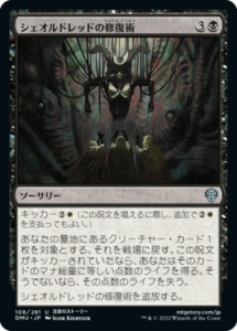 白黒のマルチカラーのキッカーを持つカードは《ベナリアの潜伏工作員》、《ファイレクシアの宣教師》、《ファイレクシアの軍馬》、《シェオルドレッドの修復術》です。