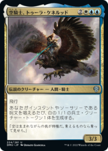 《空騎士、トゥーラ・ケネルッド》はインスタントやソーサリーを唱えるたびにトークンを生成できます。自身も飛行を持っているので、地上をトークンで止めて飛行で殴るという戦略が取れる1枚です。