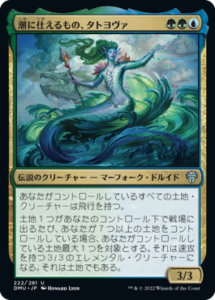 《潮に仕えるもの、タトヨヴァ》は序盤はあまり仕事はしないものの、7枚以上の土地をコントロールするようになってからはボムレア級の働きをします。土地が3/3飛行に変化するのは驚異です。