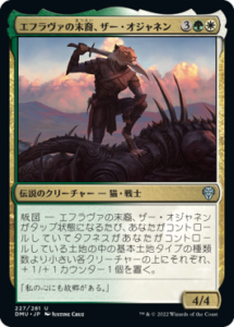 《エフラヴァの末裔、ザー・オジャネン》はタップ状態になるたび版図相当のタフネス以下のクリーチャーにカウンターを置けます。5マナ4/4に永続強化能力が付いていると考えると強力な1枚。全体強化は緑白のトークン戦略と噛み合うフィニッシュ手段として活躍が期待できます。自身が落とされないように後援でタップしてもグッド。