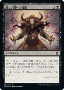 黒赤のカラーになる場合は《激しい闘いの祝福》と組み合わせることもできます。威迫持ちに接死、破壊不能を付与して一方的に2体のクリーチャーを打ち取ることができます。