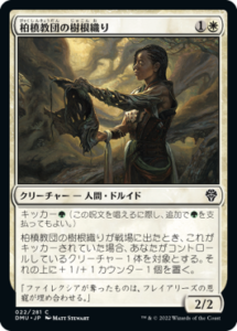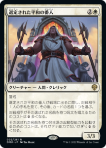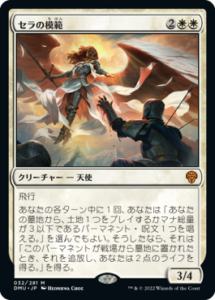 5マナ5/5警戒と良いスタッツを持つ。5マナなので色マナ軽減はほとんどおまけ的効果。白のパーマネント呪文を唱えると1/1トークンが出せる。ダブルシンボルなので色マナ拘束が厳しく、タッチでは使いにくい。