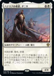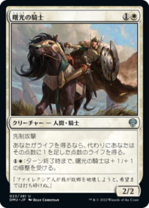 5マナ先制攻撃、警戒、絆魂。戦場に出ると制圧力が高い。装備品を出す能力はおまけとしても強力なカード。放置できないため、スタッツを上回るか除去するしかない。