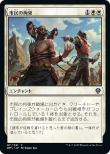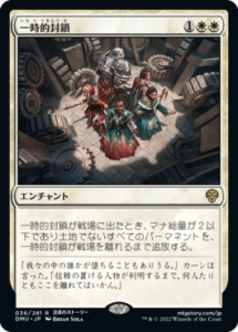 3マナ3/3警戒で十分ハイスペック。指定された呪文と起動型能力のコストが(2)重くなる。対戦相手の手札にカードが無くても効力を発揮するのは《精鋭呪文縛り》との違い。