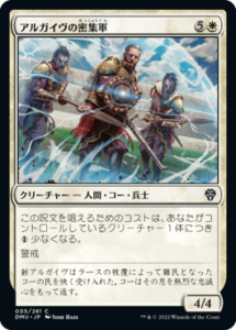 2体クリーチャーが並んでいれば4マナ4/4警戒に。サイクルの他のカードと比較するとワンサイズ小さいが早期に唱えやすい。