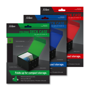 カラーはレッド、ブルー、グレー、グリーンの全4色展開になっています。お店では写真のように折りたたんだ非常にスリムな状態で売っています。トレカのサプライを多数製作しているアクラスというメーカーが出している商品になります。