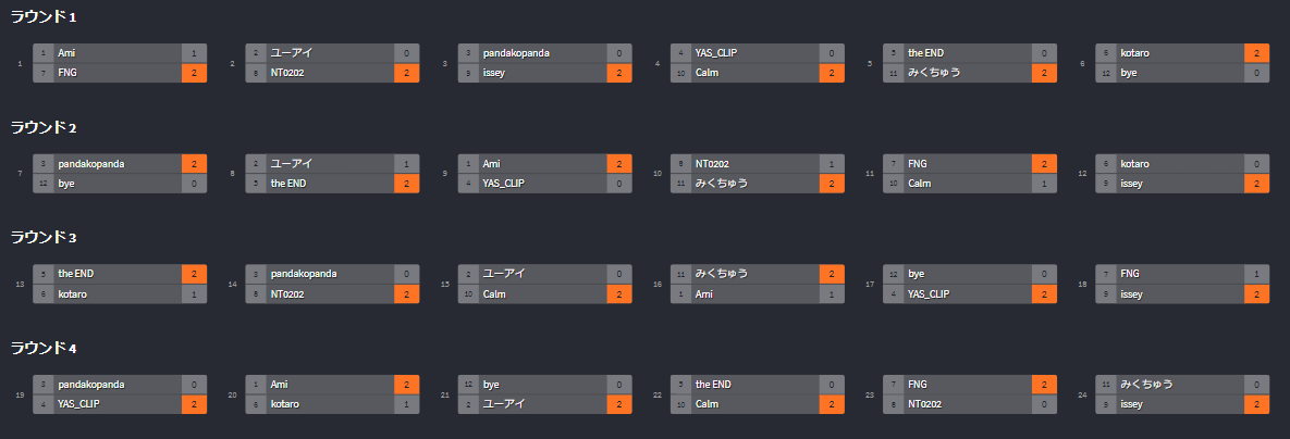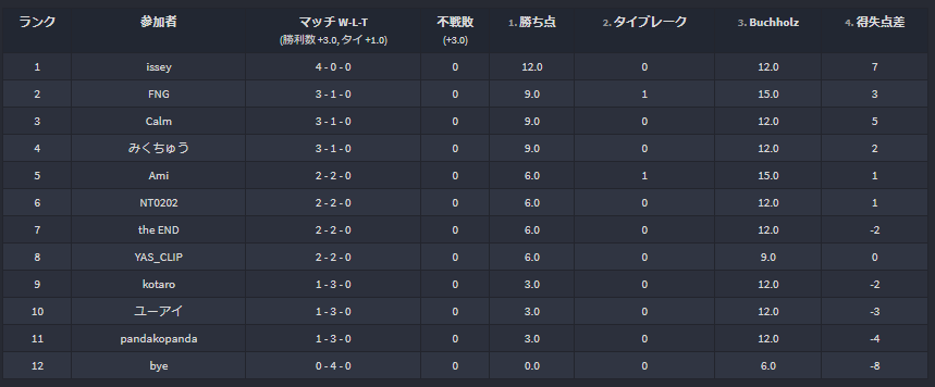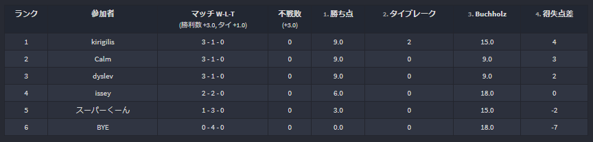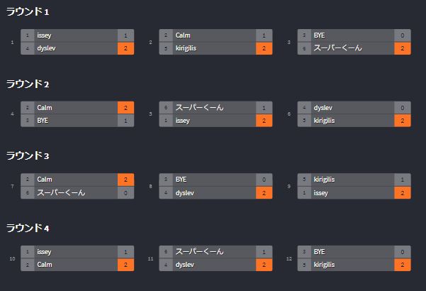 ◆スイスドロー:途中で負けても終わりにならず、対戦成績が近い相手と戦い続ける形式。一定ラウンドで終了。