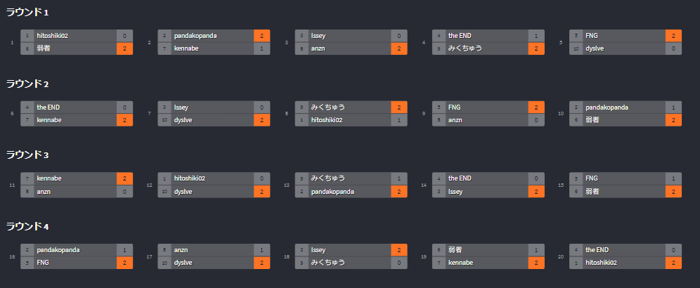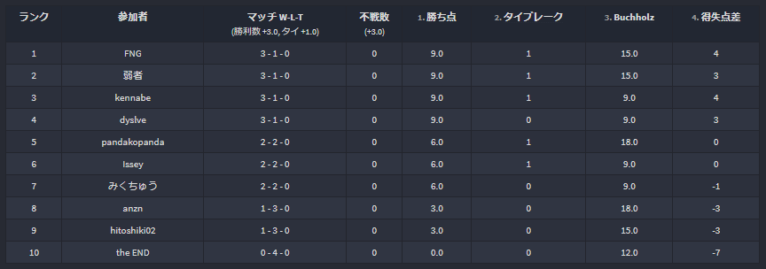 13時より1時間10分毎にラウンド開始となります。それぞれのラウンドに10分遅刻した場合は不戦敗となるので気を付けてください。