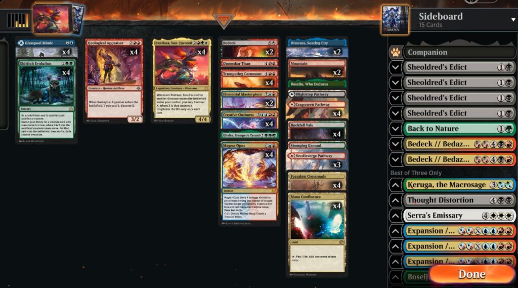 《マグマ・オパス/Magma Opus》などからマナ加速し高速で《地質鑑定士》を唱えます。《地質鑑定士》から《異界の進化/Eldritch Evolution》によって《嘶くカルノサウルス/Trumpeting Carnosaur》にさらに繋げ、さらに発見を連打して多くのクリーチャーを並べた後に《ドゥームスカールのタイタン/Doomskar Titan》で速攻を付けてフィニッシュという流れになります。