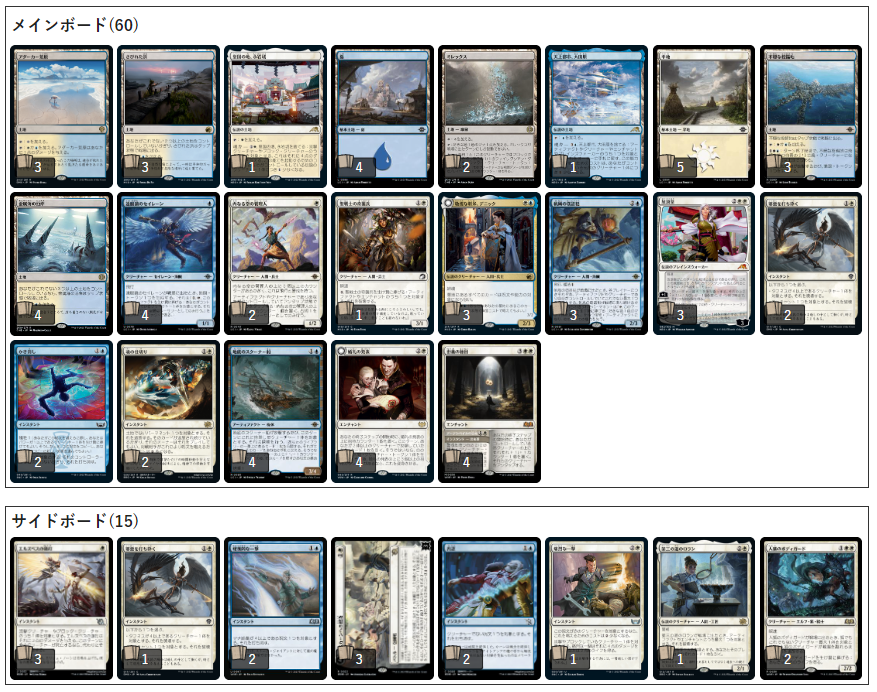こちらはスタンダードの白青アグロのデッキリストです。《帆凧の窃盗犯》や《地底のスクーナー船》などの「イクサラン:失われし洞窟」の新しいカードが多く使われているのが嬉しいですね。