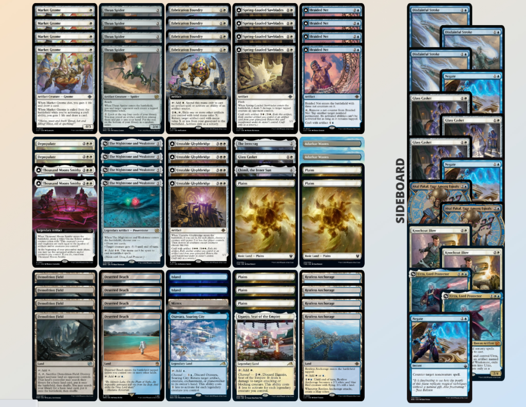 《千の月の鍛冶場/Thousand Moons Smithy》や《不安定な象形橋/Unstable Glyphbridge》の裏面をフィニッシャーとして勝利を目指すようなコントロールチックなデッキになっていますね。