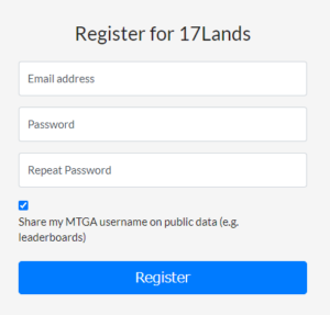 「17Lands」のホームページの上部にある「Account」→「Register」から登録します。