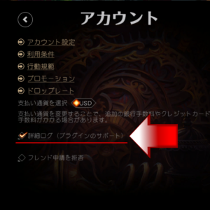 「アカウント」に進んだら、「詳細ログ(プラグインのサポート)」にチェックを入れます。