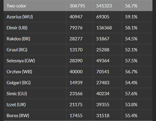 イニストラード:真夜中の狩り(MID)の2色の組み合わせを見てみると画像のような感じに。青白と青黒の勝率が高くなっていることが分かります。この統計を見ると色の強弱がなんとなく分かりますね!