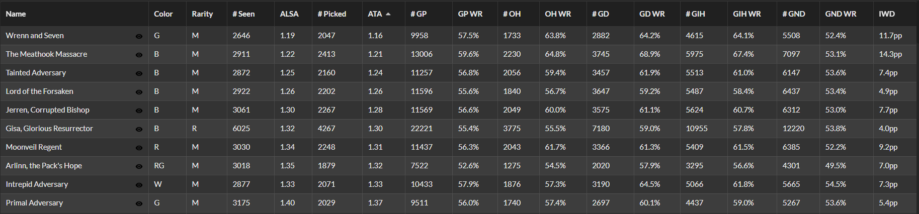 この画像はATA(Avg. Taken At;何手目に取られたか)の昇順に並べ替えたものです。イニストラード:真夜中の狩り(MID)では《レンと七番》が最も取られやすいことが分かります。