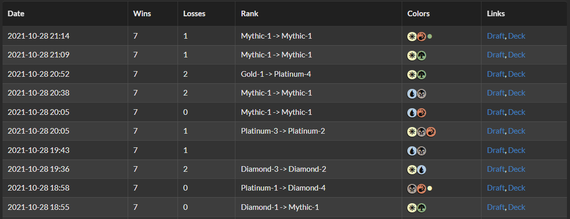 イベントで7勝したドラフトのピック譜とデッキを確認することができます。