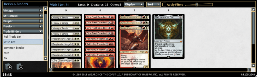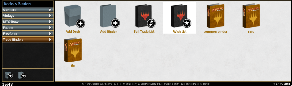 「Wish List」にカードが入っているか確認してみましょう。「Decks > Trade Binders」から「Wish List」。