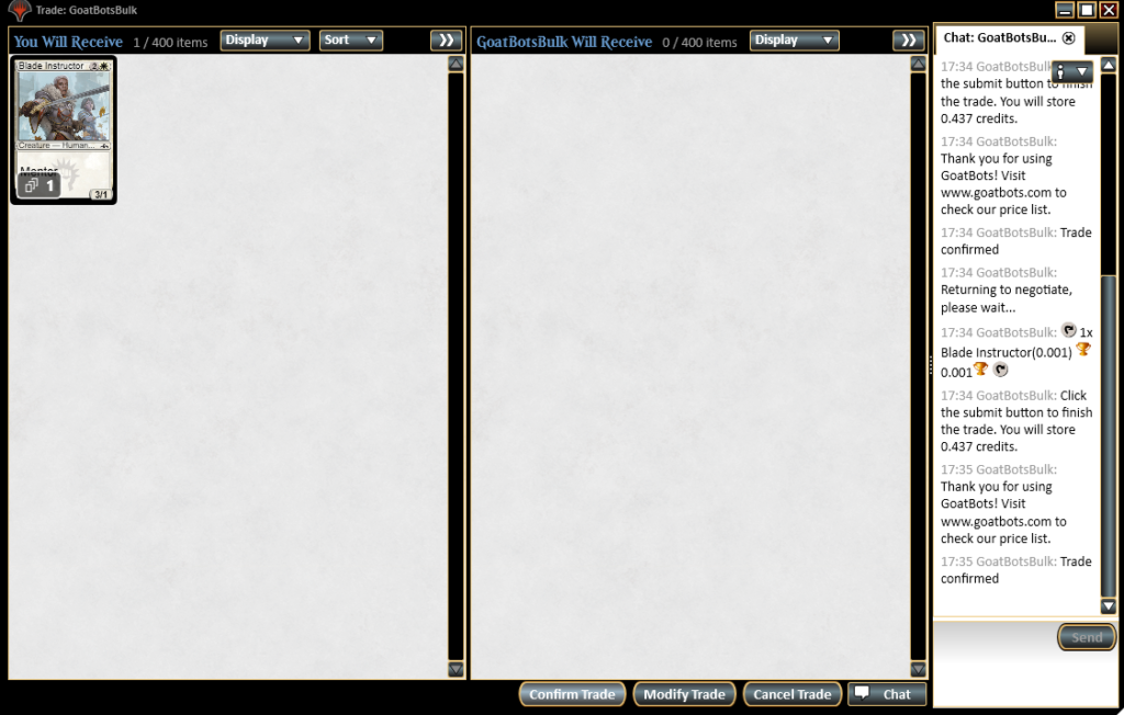 まだ、資産が少ない方は「GoatBotBulk」の利用もおすすめです。Bulkと書かれているBOTは、例えばコモンであれば、「1000枚で1tix=1枚で0.001tix」でトレードしてくれるBOTで、格安でカードが手に入ります。(BOTによって価格は異なります。)1tix以下の通貨が存在しないため、通常BOTが「credit」という形でお釣りを保存しておいてくれます。GoatBotであれば、それぞれのBOTで「credit」を共有してくれます。「Submit」を押してトレードを承認します。