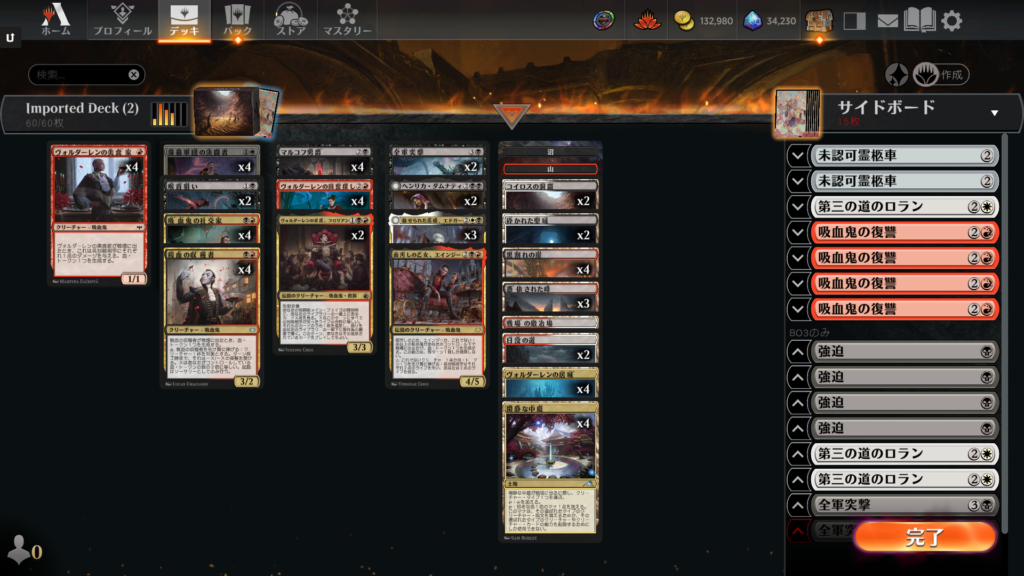 デッキのクリーチャー全てが吸血鬼で構成された部族デッキになっています。「機械兵団の進軍:決戦の後に」で加わった《マルコフ男爵》によって、台頭できるレベルに到達したように思えます。