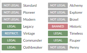 《渦まく知識》は上記のようなフォーマットで使用することができます。MTGアリーナに実装されていますがヒストリックでは禁止されており、構築フォーマットではタイムレスでのみ使用可能です。テーブルトップでは主戦場は主にレガシーとなっています。