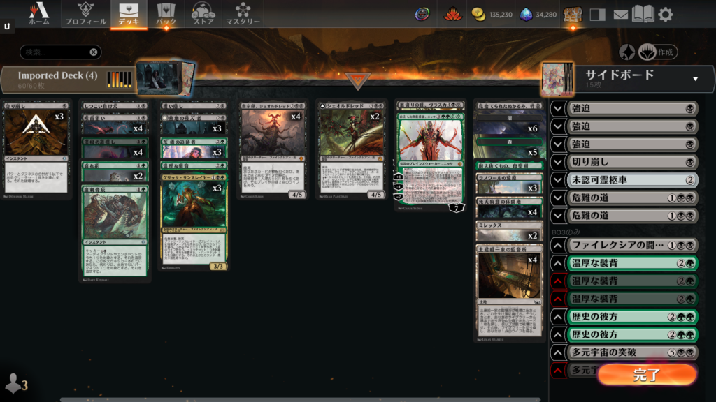 ランプ後のマナの使い先としては《シェオルドレッド/Sheoldred》や2種類のプレインズウォーカーとなっています。サイドボードには《多元宇宙の突破/Breach the Multiverse》が採用されています。