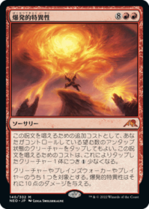 この能力で話題となっているのが《爆発的特異性/Explosive Singularity》です。マナ・コストが10マナなので10点のライフルーズと、《爆発的特異性》自身の10点ダメージで合計20点を一撃で削り切ることができるコンボになっています。