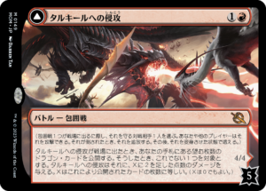 タルキールへの侵攻が戦場に出たとき、あなたの手札にある望む枚数のドラゴン・カードを公開する。そうしたとき、これでない1つを対象とする。タルキールへの侵攻はそれにXに2を足した点数のダメージを与える。Xはこれにより公開されたカードの枚数に等しい。(Xは0でもよい。)