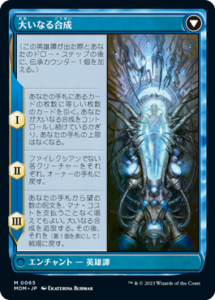 あなたの手札から望む数の呪文を、マナ・コストを支払うことなく唱えてもよい。大いなる合成を追放する。その後、それを(第1面を表にして)戦場に戻す。