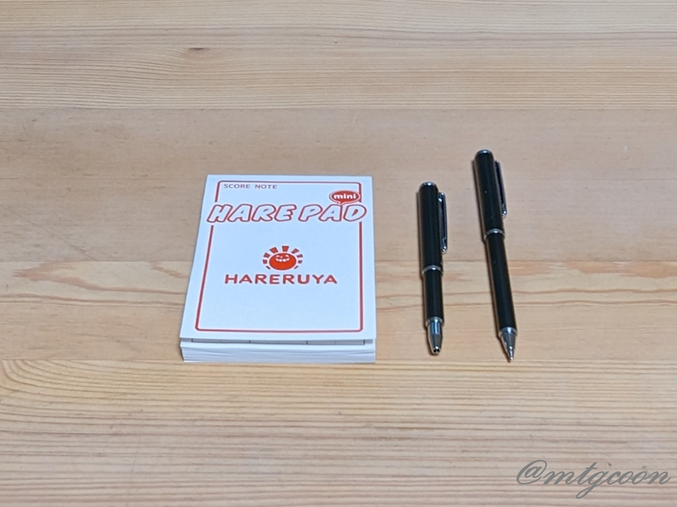 ライフを記録するための専用のアイテムとしては晴れる屋のHAREPAD「mini」が使いやすいです。こちらはカードサイズになっているのでデッキケースに入れておくことができます。実際のところ、メモ帳はライフをメモできるサイズのものであればなんでもよいです。