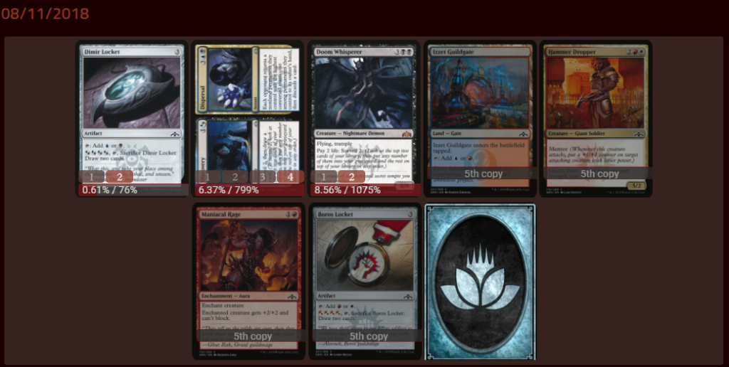 デッキ作成に必要なワイルドカードの数、デッキの勝率、使用人数も記載されているので、Arenaのメタゲーム把握に役立ちます。