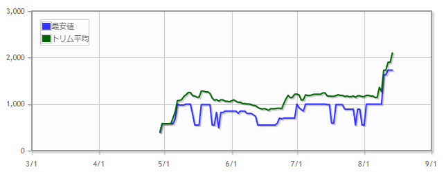 《注目の捕縛》のシングル価格は1000円前後で推移していましたが、8月中旬になって値上がりを見せ2000円を超える価格まで上昇しています。