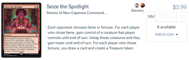 《注目の捕縛/Seize the Spotlight》は「ニューカペナの街角統率者デッキ」に収録されたソーサリーです。