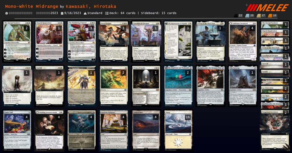 2023/9/17に行われたスタンダードの「マジック:ザ・ギャザリング ジャパンオープン2023」の準決勝進出を果たした「白単ミッドレンジ」のリストになります。