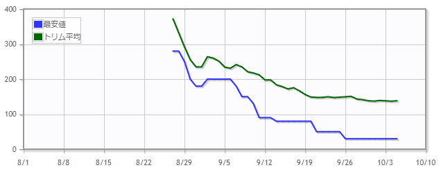 現在の参考価格は150円程度です。発売当初からすこしずつ値段が下降傾向にあり現在は落ち着いた値になったように思います。