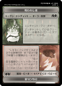 《悪意ある呪詛術士》は戦場に出たときに呪われし者・役割・トークンを生成します。(上の画像のトークンは見やすいようにカード画像を上下反転しています。)