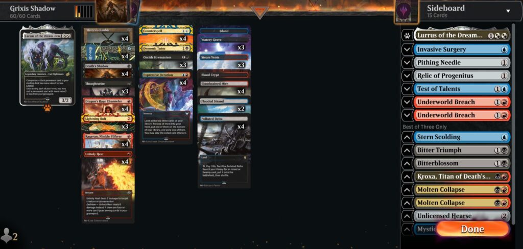 「グリクシスデスシャドウ」は《死の影》をフィニッシャーにおいて、《敏捷なこそ泥、ラガバン/Ragavan, Nimble Pilferer》や《ドラゴンの怒りの媒介者/Dragon's Rage Channeler》で攻め上げていくデッキとなっています。