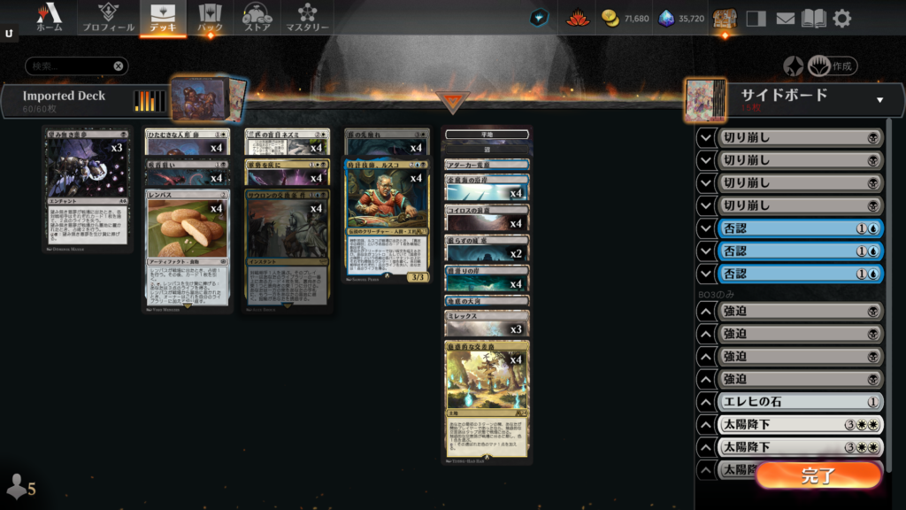 アルケミーのミシック上位に到達したとの報告があった《ひたむきな人形師》入りの「エスパーコントロール」のデッキリストです。
